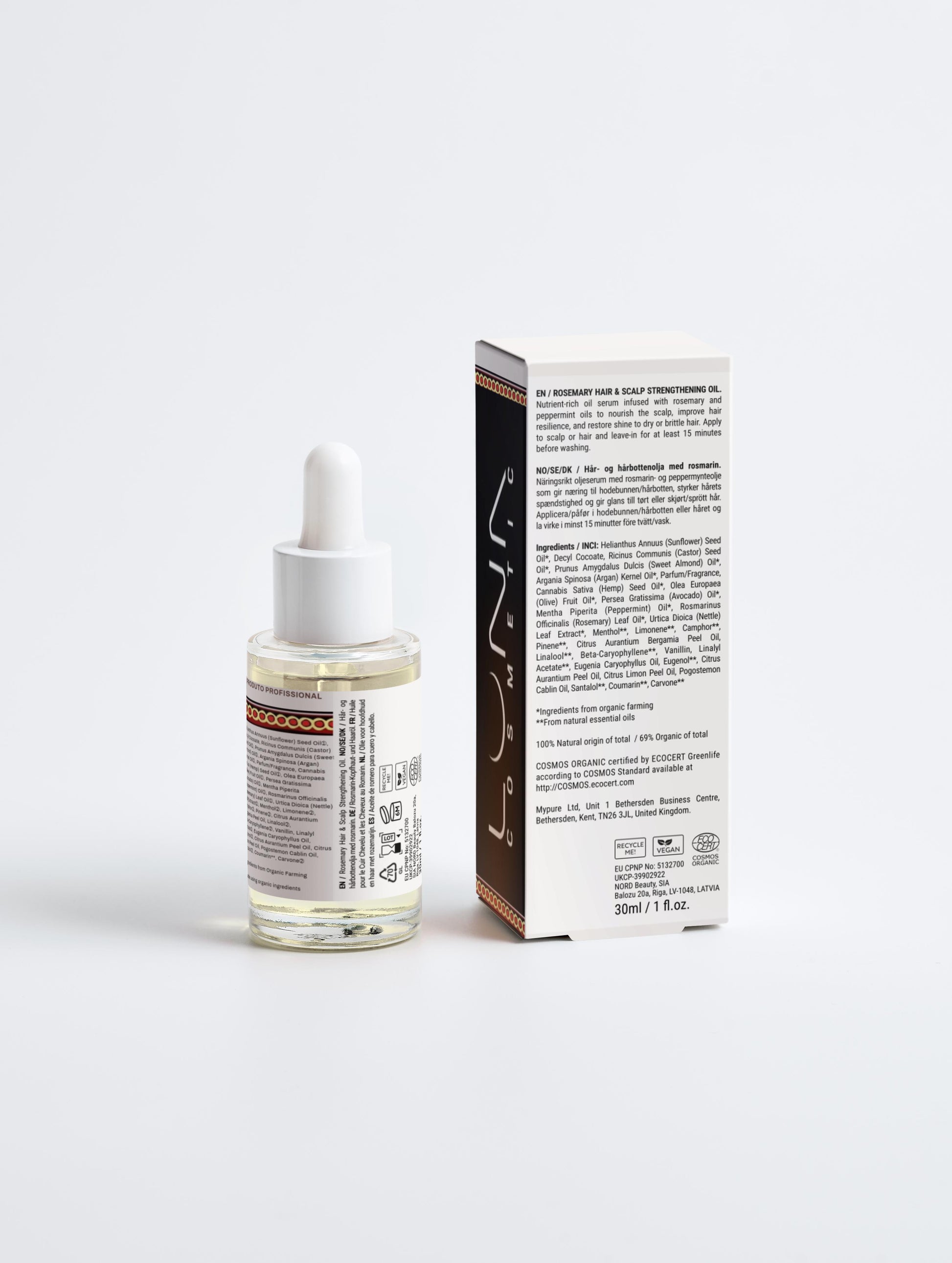 Óleo rico em nutrientes, infundido com óleos essenciais de alecrim e hortelã-pimenta, que nutre profundamente o couro cabeludo, melhora a resistência dos fios e devolve o brilho aos cabelos secos ou quebradiços.